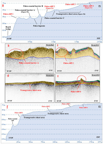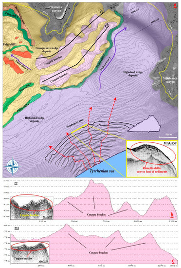 P10 (Figure 6c) shows the morphological features of the shallowest second level of paleo-cuspate beaches (between −70 m and 62 m), extending for about 1.4 km. Here, in fact, the paleo-beaches tend to deepen towards the east, at the same time but maintaining an excellent degree of preservation (steep morphologies and gradients up to 8°). Furthermore, the MAG551 and MAG553 seismic profiles (see the inset in Figure 6b,c) show the acoustic facies of these paleo-cuspate beaches, characterized by a high amplitude of the reflectors and a poor penetration of the acoustic signal, interpreted as being due to the presence of coarse-grained sediments.