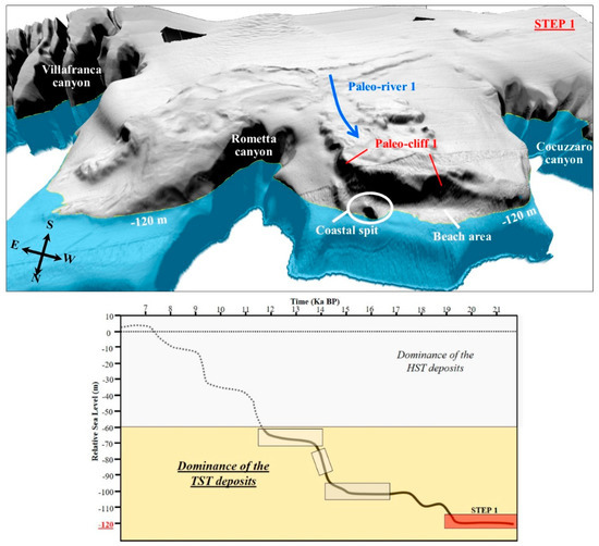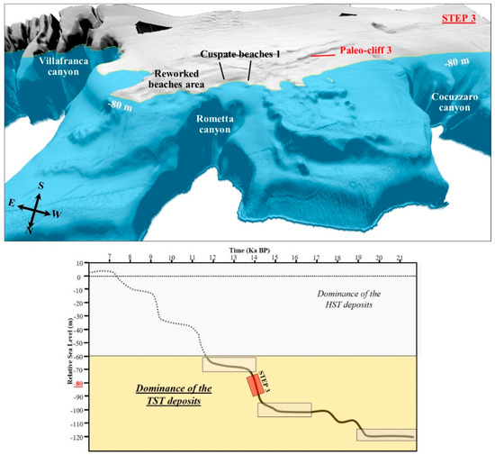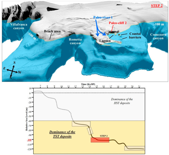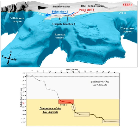 The contour at −70 m well marks the last transgressive geomorphic elements outcropping on the seabed (Figure 10). In fact, at this stage, the development of a second level of cuspate beaches and, northwards, of a longitudinal coastal barrier on the paleo-cliff 4 occurs. The latter represents the depositional expression by the paleo-river 3, which flows in a north-east direction, parallel to the paleo-cliff 4, and discharges its sediments near the head of the Villafranca canyon.