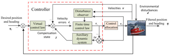 In this section, a finite-time control law is developed for the ship DP system; this law is combined with the designed system, the disturbance observer, and the auxiliary dynamic system. The structure of the DP system is shown in Figure 2.