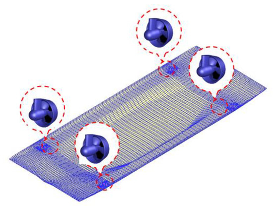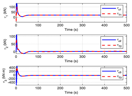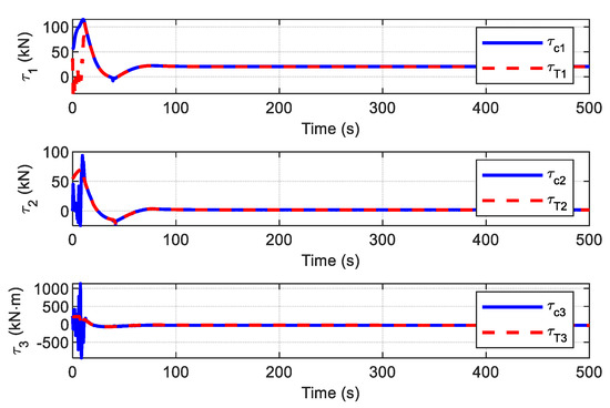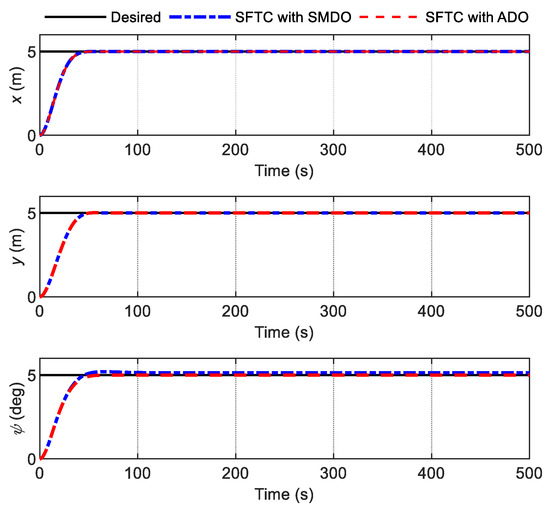 The objective of this subsection is to demonstrate the effectiveness of the proposed finite-time control scheme, which includes the designed ADO and the auxiliary dynamic system (29). Here, using the marine environmental parameters of Case 2, which are given in Table 2, the system’s initial states and the parameters needed for the disturbance observer and controller are all the same as mentioned above. The DP system for ships has four actuators. The designed control law is distributed into each actuator. According to whether the proposed control scheme has the ADS, the simulations are carried out in the following two cases.