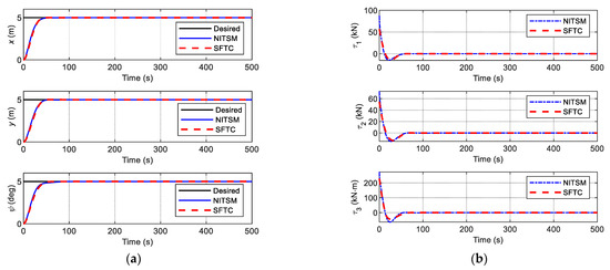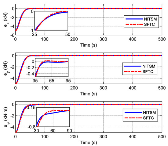 Furthermore, the DP control systems above are all asymptotically stable, which implies that the DP system achieves its control goal with infinite time. Finite-time control using the terminal sliding mode (TSM) method can speed convergence to equilibrium. Moreover, a closed-loop system with a finite-time controller generally shows better anti-disturbance and higher-accuracy performance. Therefore, due to its inherent robustness, finite-time DP control has been gradually gaining popularity [10,26,27]. In [26], a passive fault-tolerant controller was developed using a nonsingular integral terminal sliding mode, which achieves global finite-time convergence of tracking errors. In [27], an adaptive nonsingular fast terminal sliding-mode control was proposed for a nonlinear system with external disturbances, which achieves finite-time tracking control at a fast convergence rate and ensures chattering-free dynamics.