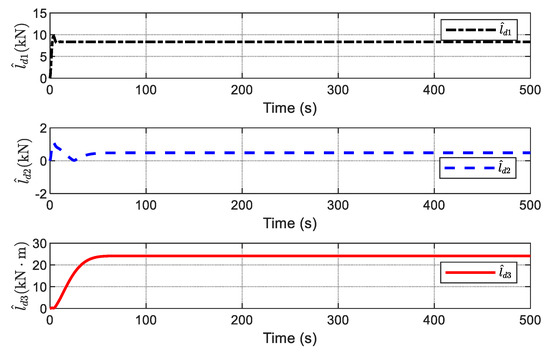 We know that the disturbances can be effectively estimated in finite time using (7) and (8). However, the upper bound of the disturbances can only be calculated roughly. Moreover, the high-frequency switching value given by (8) may degrade the performance of the DP control system. Therefore, in order to modify the SMDO, an adaptive scheme is proposed to estimate the upper bound of disturbances . As such, we obtain the adaptive disturbance observer (ADO).