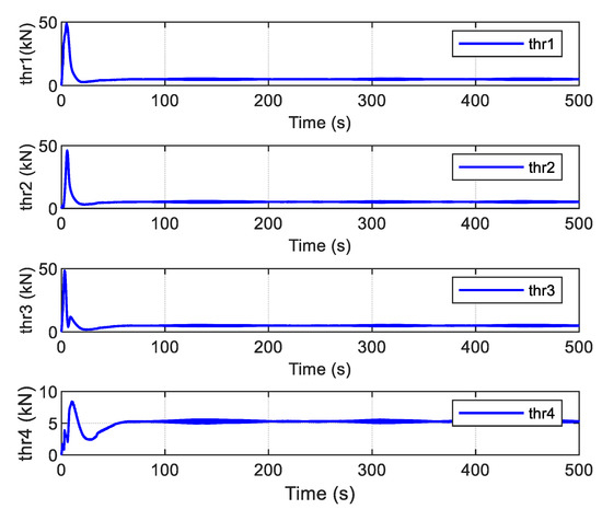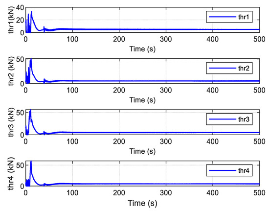 The command control law and the actual forces provided by the thrusters are shown in Figure 20. Compared with the FTC with ADO, it can be observed that the curves of the control law with the auxiliary term are much smoother in the initial stage and more easily executed by the thruster system. The forces of each thruster are given in Figure 21, which shows that iterative compensation using the auxiliary dynamic system significantly modifies the control inputs and reduces the effect of actuator saturation.