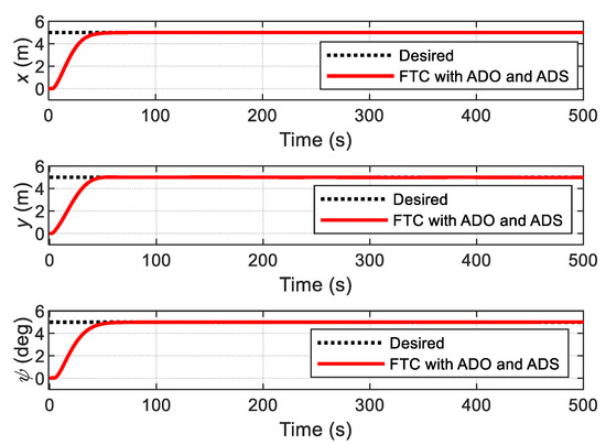 Using the proposed FTC with ADO alone, the simulation results are shown in Figure 15, Figure 16 and Figure 17. In Figure 15, it can be observed that the curves of the actual position and heading of the ship fluctuate greatly; the time taken to reach the steady state (about 100 s) is much longer than the time (about 50 s) shown by the red dotted line in Figure 10. The reason for this is that the errors between the actual and desired trajectories are too large in the initial stage; control inputs try to reduce these differences by responding quickly. However, the calculated command control inputs have not been exactly executed by the thrusters due to the physical limitations of the actuators, as shown in Figure 16. The forces of each thruster are shown in Figure 17, and it is observed that the forces required for each thruster cannot be produced due to the amplitude limitations of the turning rate of the thrusters in practice.