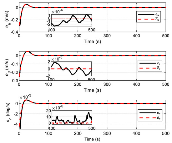 The performance of the proposed FTC with ADO and ADS is evaluated, where the ADS is applied to deal with the actuator constraints, and its design parameter is selected as . The curves of the position and heading of the ship are depicted in Figure 18; the position performance is found to be improved, in terms of convergence time, compared with that of FTC with ADO alone. Furthermore, the original velocity tracking errors are iteratively compensated using the ADS so that the modified velocity tracking errors are closer to zero, as shown in Figure 19. Moreover, the deviations between and (that is, the state vector of ADS) are bounded, and the theoretical analysis is verified.