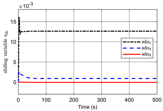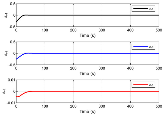 Furthermore, because the derivative of is not strictly negative, the auxiliary sliding surface of the ADO is bounded and converges into a region of origin, as is demonstrated in Figure 24. The sliding surface is given in Figure 25, and it is observed that the sliding surface converges to zero within about 50 s. This is because the exponential reaching law guarantees that the sliding surface is reachable at high speed.