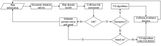 The USVs encounter unpredictable obstacles, such as ships in motion, during navigation. Collisions can cause significant economic losses and environmental pollution. There are no regulations specifically for the USVs. However, USVs should follow the International Regulations for Preventing Collisions at Sea (COLREGS) [3], which has become the consensus of relevant research. Common collision avoidance algorithms include the artificial potential field (APF) method [4,5,6,7,8], velocity obstacle (VO) algorithm [8,9,10,11,12,13] and some intelligent algorithms [13,14,15,16,17,18].
