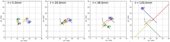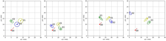 According to the encounter scenario proposed by Woerner [39], four-ship encounter scenarios are established in this paper. Figure 5 shows the initial position of ships. The information of the ships is shown in Table 4, Table 5, Table 6 and Table 7. Through simulation, the collision avoidance is simulated when the TS follows the COLREGs. On the basis of the four scenarios, the collision avoidance of the USV is simulated when the TS temporarily turn.