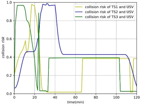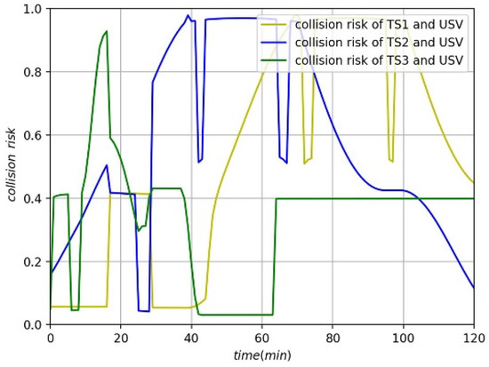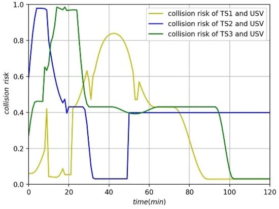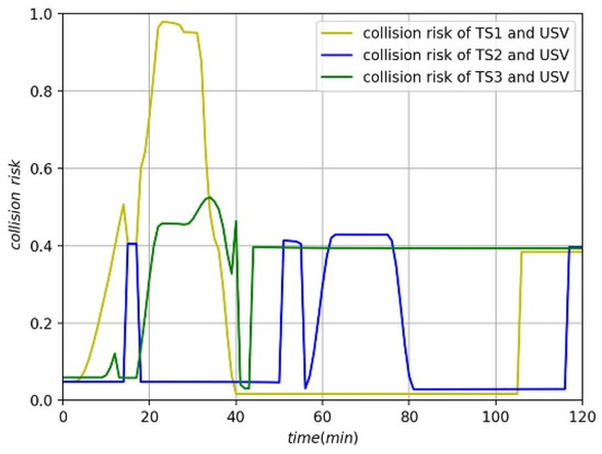 Figure 9 shows the collision risk between each TS and USV. The collision risk between the USV and the TS2 is greater than 0.5 at the beginning. The TS2 does not change course because the two vessels will not be in collision if they are sailing at the original velocity. The collision risk between the USV and the TS3 is greater than 0.5 at the ninth min. Given that the collision risk between the USV and the TS2 does not increase after the USV turns right, the USV turns right to avoid the TS3. This action can also achieve the purpose of overtaking the TS1. Figure 10 shows the process of collision avoidance. Figure 11 shows that the USV does not enter the ship domain of any TS during the navigation.