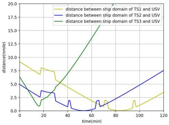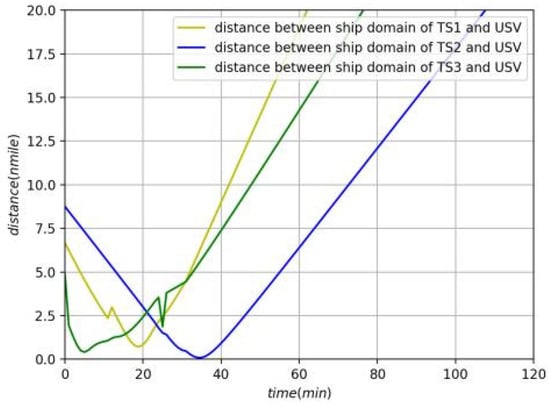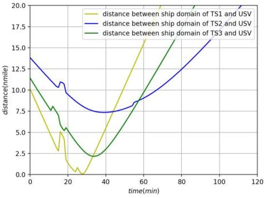 Figure 12 shows the collision risk between each TS and USV. The TS3, as the give-way ship, turns right to avoid the USV at the beginning of the navigation. The USV and the TS1 are in a head-on situation. According to the improved VO, the two vessels will not be in collision if they are sailing at the original velocity. Therefore, the USV keeps going straight. At the 24th min, the collision risk between the USV and TS2 is greater than 0.5, and the USV turns right. Figure 13 shows the process of collision avoidance. Figure 14 shows that the USV does not enter the ship domain of any TS during the navigation.