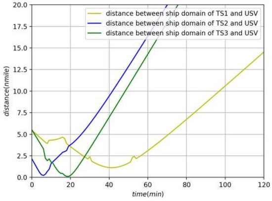 Figure 15 shows the collision risk between each TS and USV. At the 15th min, the collision risk between the USV and the TS1 is greater than 0.5. Both ships start to take collision avoidance actions. At the 18th min, the two ships resume the original course. During the navigation, there is no collision risk between the USV and other TSs, and thus there is no other collision avoidance operation. Figure 16 shows the process of collision avoidance. Figure 17 shows that the USV does not enter the ship domain of any TS during the navigation.