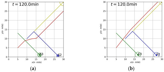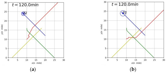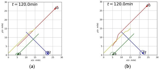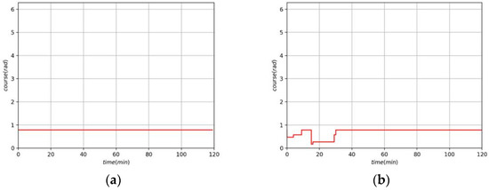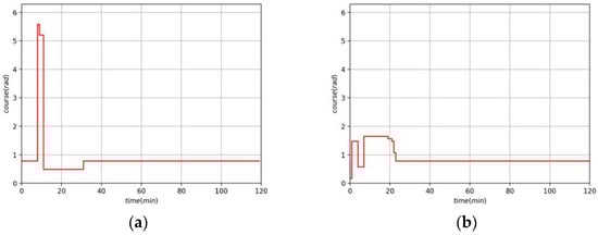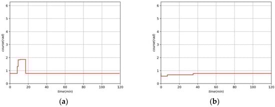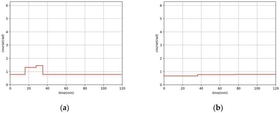 Course of USV. (a) Course of USV based on the proposed decision method. (b) Course of USV based on the VO algorithm.