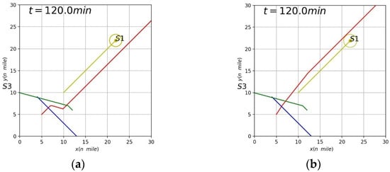 The collision avoidance of VO algorithm in the same scenarios is simulated. The collision avoidance effect of the improved algorithm and the VO algorithm is compared. The results of the simulation verify the feasibility and effectiveness of the proposed decision method. Considering the running time of the algorithm, 1 min is used as the time step. The simulation duration is two hours. In the simulation charts, the USV is represented by S0, and the TS1, TS2 and TS3 are represented by S1, S2 and S3.