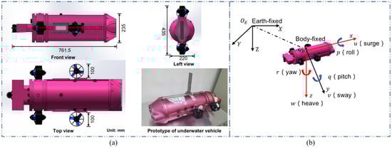 Figure 1a shows the overall mechanical structure of the underactuated underwater vehicle. The underwater vehicle is torpedo type, equipped with an LED light and two cameras. The actuated degrees of freedom (surge, heave, and yaw) are driven by four thrusters. The overall configuration of the underwater vehicle is symmetrical about the and planes. The size of the underwater vehicle is 761.5 mm × 435 mm × 220 mm (), and its dry weight is approximately 16.5 kg. The basic parameters of the underwater vehicle are provided in Table 1. In this paper, the underwater vehicle is assumed to operate at a depth that is far from the water surface.