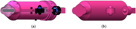 Figure 2a shows the 3D model of the underwater vehicle. The underwater vehicle is equipped with many thrusters, sensors and connectors, causing many small appendages and cavities (i.e., external thrusters, cameras’ window) in its 3D model, which increase the difficulty of mesh generation and the cost of computation. In this work, to meet the requirements of Fluent on ANSYS™ Workbench software and improve the reliability of numerical results derived by the proposed CFD method, the 3D model of the underwater vehicle is simplified. As shown in Figure 2b, small appendages and cavities that have little effect on the overall hydrodynamic performance of the underwater vehicle are removed, while its shape features are well retained. In addition, the four thrusters are simplified as four static cylinders.