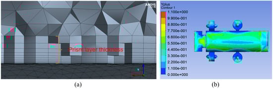 In this paper, the curvature and the proximity size functions are applied to mesh generation for the underwater vehicle model and the fluid domain. In our CFD method, unstructured meshes are generated to fit the model’s shape, because they can be skewed or stretched without degrading simulation performance. Furthermore, the face-sizing meshing method is adopted to control the mesh size on the underwater vehicle model’s surface and the body-sizing meshing method to control the mesh size of the computational fluid domain. Finally, the inflation function is applied to capture the flow properties of the boundary layers around the underwater vehicle model. Specifically, as shown in Figure 3a, prism layer meshes are generated on the surface of the underwater vehicle model by inflation function. The first layer thickness of the prism layer is determined based on the formulas summarized in [39] and the to be 1. The value of growth rate and the number of prism layers are determined empirically by ensuring that the volume of the grid of the final inflation layer is similar to that of freestream cells.