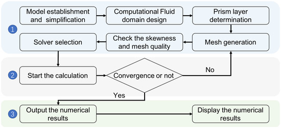 where and are the fluid’s velocities in i and j directions, respectively; is the rectangular coordinate of space; is the density of the fluid; p is the pressure term; t is the physical time of motion, v is the dynamic viscosity, is the Kronecker delta; is the Reynolds stress tensor based on the Boussinesq hypothesis [37].