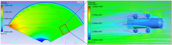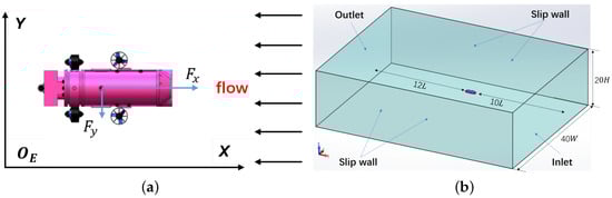 Towing test simulations of the underwater vehicle includes straight-line motion along the x, y, and z-direction. Figure 5a shows the schematic of the straight-line motion of the underwater vehicle along the x-direction. Underwater vehicles are static in the computational fluid domain, facing flows with variable velocities (−1.2 m/s to 1.2 m/s), is the longitudinal force, and is the lateral force. To simulate the straight-line motion in the towing test of the underwater vehicle, the computational fluid domain is designed with the ITTC guidelines as shown in Figure 5b. In addition, the length of the computational fluid domain is set at 23 L (17.5 m), the width is set at 40 W (11.84 m), and the height is set at 20 H (4.4 m).