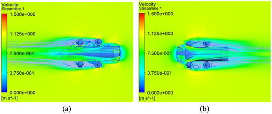 Comparison of flow field streamlines around the underwater vehicle model. (a) Flow field streamlines diagram around the underwater vehicle moving in a straight line along the positive x-direction; (b) flow field streamlines diagram around the underwater vehicle moving in a straight line along the negative x-direction.