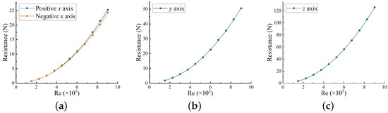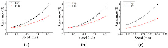 Resistance comparison of the underwater vehicle obtained by the CFD simulations and the physical experiment platform. (a) Resistance comparison along positive x-direction; (b) resistance comparison along negative x-direction; and (c) resistance comparison along y-direction.