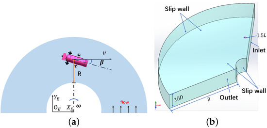 (a) Schematics for the rotating arm test of the underwater vehicle. (b) Computational fluid domain designed for the rotating arm test simulation.