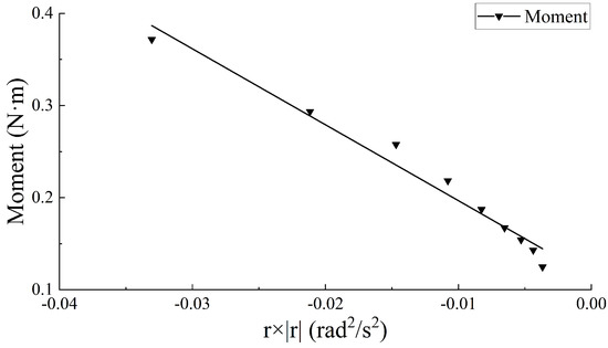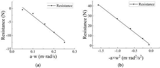 Similarly, with the same settings, the proposed numerical method is used to simulate the straight-line motion of the underwater vehicle along the y-direction and z-direction. Figure 7b,c shows the fitted curves of the numerical estimated data with respect to . Based on the two fitted curves, the velocity-dependent hydrodynamic coefficients and can be obtained.