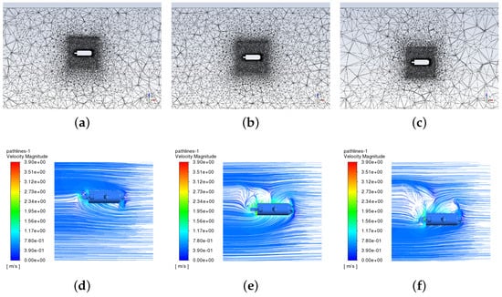 In this paper, the pure heave motion simulation of the underwater vehicle is selected to show how to estimate the values of hydrodynamic coefficients. In heave motion simulation, the UDF defines the underwater vehicle’s oscillatory motion. The setting of other parameters of this simulation is shown in Table 7. Figure 13a–c shows the mesh deformation and movement of the computational fluid domain for pure heave motion simulation of the underwater vehicle with the motion stroke of 0.04 m during a period of 20 s. It can be seen that the inner zone containing the underwater vehicle model moves up and down along the z-direction harmonically. Figure 13a shows the initial positions of the underwater vehicle model, whereas Figure 13b,c show the maximum and minimum extents of deformed meshes, respectively. The sliding mesh method we used in the PMM test simulation works well as desired. The meshes around the inner zone move smoothly, and no invalid meshes or negative volume cells are generated in the computational fluid domain. Figure 13d–f shows the flow field streamlines around the underwater vehicle for pure heave motion at t/ = 0.25, 0.50, 0.75. Figure 14 shows the change of resistance of underwater vehicles at Hz, and the Fourier function is adopted to fit the change of resistance with time. From the fitted curves, the numerical results () of pure heave motion simulation of the underwater vehicle can be derived, as shown in Table 8. Based on the Table 8, the heaving resistance versus the motion parameters and are fitted in Figure 15a,b, and the slope of the fitted lines are the estimated hydrodynamic coefficients and . The hydrodynamic coefficients of the underactuated underwater vehicle corresponding to the other three unsteady motions (i.e., pure surge motion, pure yaw motion, and pure sway motion) can be numerically estimated similarly.