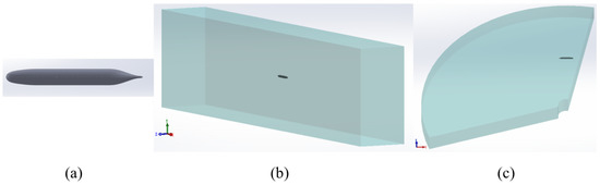 (a) Standard SUBOFF model; (b) computational fluid domain for towing test simulation of SUBOFF model; and (c) computational fluid domain for rotating arm test simulation of SUBOFF model.