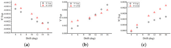 To validate the effectiveness of the rotating arm test simulations, our CFD method added is applied to the SUBOFF model. The numerical results of the estimated hydrodynamic coefficients obtained by rotating arm test simulation are compared with the published experimental data [40]. The rotating arm test simulation settings are similar to the standard experiment reported in [41]. As shown in Figure 16c, the radius of the computational fluid domain is set to 20.32 m, and the drift angle ranges from 0 °C to 16 °C. The comparison between the numerical results and the reported experimental data is shown in Figure 17. The rotating arm test simulations can provide reliable performance in hydrodynamic coefficient estimation.