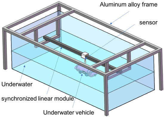 To validate the estimated velocity-dependent hydrodynamic coefficients of the underwater vehicle, the towing tank test of the SUBOFF model is conducted in a physical experiment platform. Figure 18 shows the design of the physical experiment platform. It is a tank pool with a length of 4.12 m, a width of 2.01 m, and a height of 1.22 m. The synchronized linear module, consisting of a synchronized belt, a servo motor, and a guide rail, is used to drive the slider to move on the guide rail with a minimum speed of 0.003 m/s and a maximum speed of 6 m/s. The underwater vehicle is connected to the slider through a sting so that the SUBOFF can get the same surge speed as the slider. In the towing test experiment, the load cell used is the Optoforce six component load cell. The load cell can measure the force (moment) in (around) the x-axis and y-axis, and the z-axis.