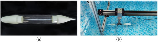 To calibrate the established experiment platform, towing test experiments of the standard SUBOFF model in the physical experimental platform are carried out, as shown in Figure 19. The SUBOFF model is connected to the slider through the sting connector. The surge speed of the SUBOFF model is increased from 0.6 m/s to 1.3 m/s with an increasing step of 0.09 m/s. The experimental results are compared with the published data reported in [24], as shown in Figure 20. It can be seen that the experimental data collected from the physical experiment platform are in good agreement with the reported data, which demonstrates the effectiveness of the physical experiment platform.