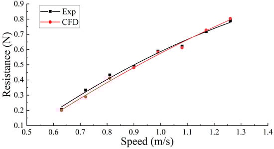 In this study, the SUBOFF model is used as the standard model to verify our towing test simulation, because the experimental data of the SUBOFF towing test can be obtained in [24]. The experimental data can be used as a benchmark to verify the effectiveness of towing test simulation method. The resistance estimated by our method is compared to the reported experimental data. As shown in Figure 16a,b, the settings of towing test simulation of the SUBOFF model in this paper is consistent with that of the standard experiment reported in [24]. From Table 10, it can be seen that the errors range from 0.72% to 3.63%, which demonstrates that the hydrodynamic coefficients obtained by our towing test simulation are in good agreement with the experimental data, and the numerical results derived from our towing test simulation are reliable.
