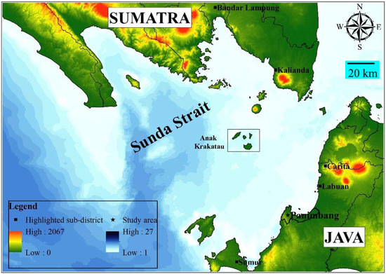 The official number of casualties reported was 437 deaths, 31,942 injuries, and 10 still missing [22,23]. The total numbers of casualties in Banten Province and Lampung Province were 317 and 120, respectively. The Panimbang subdistrict located in Pandeglang, Banten, was chosen as the study area in this research. It has a total population of 51,692 in the Panimbang subdistrict and the highest number of deaths (129 out of 295) in the Pandeglang District due to the December 2018 Anak Krakatoa tsunami. This subdistrict also had the third highest number of damaged houses in Pandeglang [24].