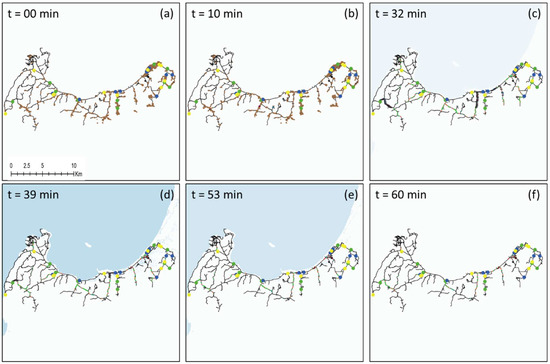 Figure 3c shows approximately at t = 32 min that the first tsunami wave arrived at the coastline. Figure 3d shows the evacuation process at t = 39 min. At this stage, the tsunami wave height reached the maximum (1.35 m). Fatalities or casualties occurred when the inundation level exceeded Hc (0.5 m), represented by red agents. Figure 3e shows that the total deaths increased at t = 53 min, while the inundation level increased again to 0.95 m. In Figure 3f, the simulation is completed at t = 60 min. At the end of the simulation, the total number of evacuees and deaths are counted and used to consider optimum evacuation shelters. The tsunami height waveform over time observed at the Marina Jambu tide gauge is shown in Figures S2 and S3 in the Supplementary Material.