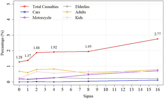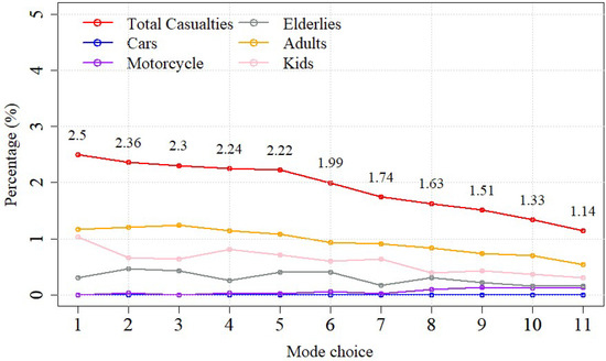 Total deaths (%) depending on the transportation mode choice as in Table 1.