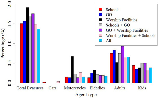 In addition, in the simulations, the scale parameter is set to a constant (σ = 1.65) with transportation mode choice 11. The evacuation shelters used are a combination of 10 proposed VESs and HESs, including schools (14), worship facilities (10), and government offices (9). The additional simulation scenarios are based on the delay time in the agent decision-making time. It starts with the immediate evacuation, i.e., τ = 0 min, and then continues to τ = 10, 15, 20, and 25 min. At τ = 34 min, the tsunami arrives at the land area, and at τ = 39 min, the tsunami reaches its maximum wave height.