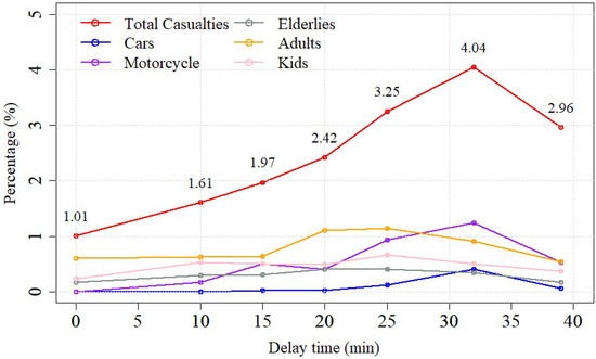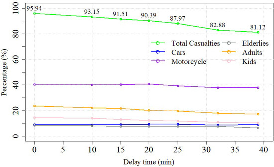 Resulting casualties (%) depending on the delay time, τ (min).
