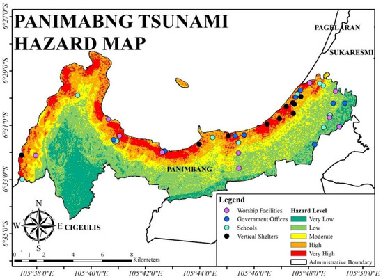 To propose and evaluate the effects of tsunami shelters in the Panimbnag area, tsunami risk hot spots were estimated based on the results of scenario analysis. The result of the worst case, scenario 6, is presented in Figure 10 with the locations of casualties. Most of the casualties and hot spots are found in the eastern Panimbang region, where the population density is high. Furthermore, the tsunami hazard map in the Panimbang area is assessed using GIS-based multicriteria analysis. The physical criteria considered are elevation, slope, distance from the shoreline, and distance from riverbanks. Next, weights for each criterion and class scores to produce tsunami hazard levels in the study area are implemented from [47,48], as shown in Table 4. The distance from the shoreline is based on the MSL.