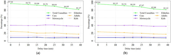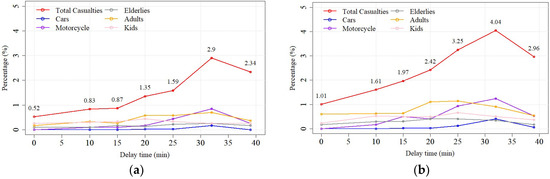 Figure 12a,b exhibit the total evacuee (%) resulting from the simulations with the VESs and HES combination and HESs only, respectively. The evacuees do not significantly increase compared to those of the HES-only simulation, except in the 6th scenario. At the immediate evacuation τ = 0 min, the increment in the evacuee percentage is approximately 1% and slightly increases by 0.2% in the 7th scenario. The 6th scenario result shows an impact on the evacuee percentage of approximately 3.5–4%. Figure 13a,b presents the casualty percentages of both simulations. Both simulation trends are analogous, except in the casualty percentage of the 3rd scenario in the VESs and HES simulations. As noted above, the casualty percentage is slightly increased compared to the 2nd scenario. In general, the effect of the proposed VESs on the simulation can decrease the casualty percentage by 1.25–2 times, implying that adding VESs in high and very high tsunami risk areas has a significant effect on decreasing the mortality rate.