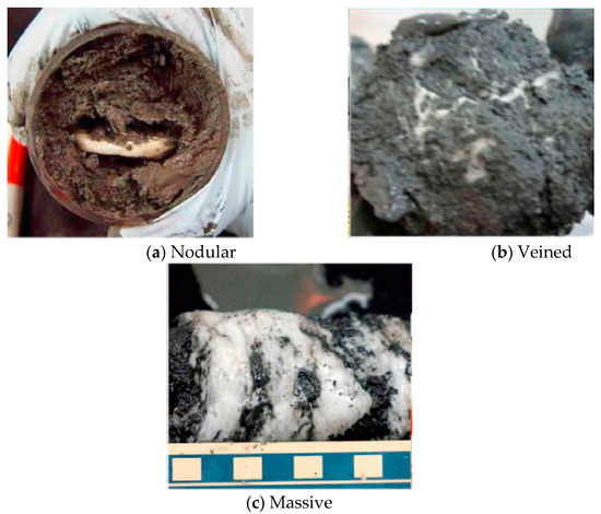 Limited by exploitation technology, it was believed that the exploitation of hydrates in sandy sediment reservoirs with higher porosities and permeabilities was the preferred scheme, and testing was mainly based on HBSs synthesized from sandy sediment [19]. However, a lot of hydrates are found in fine-grained sediments on the sea floor [20]. In sandy sediments, hydrates occur in the form of pore distributions and are approximately homogeneously distributed macroscopically. The occurrences are commonly in the particle-filling mode, particle-support mode, and cementation mode [21], as shown in Figure 1. However, in shallow, fine-grained sediments, hydrates occur in the form of segregated masses, such as nodular, veined, massive forms, etc. [22,23,24], as shown in Figure 2. The occurrences state of hydrates in sediments can be divided into two types: segregated (including fracture-filling, veined, nodular, thick-layer, etc., and the hydrates are heterogeneously distributed macroscopically) and pore type (including pore-filling, cementation, particle wrapping, skeleton-support, local aggregation, etc., and the hydrates are approximately homogeneously distributed macroscopically) [25]. The different occurrences of hydrates lead to great differences in the mechanical properties, such as the mechanical behavior and permeability, of sediments. Disturbance after hydrate dissociation and phase transformation may introduce local severe decreases in the mechanical properties of sediments in silt clay sediments. Inherent difficulties in hydrate formation hinder laboratory studies, which are thus limited to geophysical logs and numerical simulations and neglect the effects of hydrate formation on surrounding sediments [26,27]. Some scholars have also carried out preliminary explorations based on the synthesis of segregated hydrates from argillaceous clayey-silt sediments in the Shenhu Sea, but the preparation method of samples is incapable of controlling hydrate morphology [28].