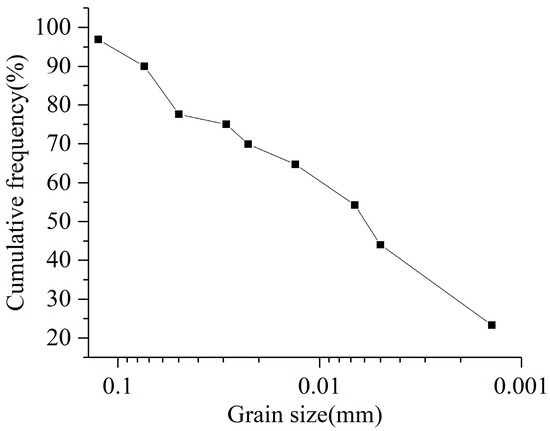 The engineering classification of the test soil: particles with a particle size of less than 0.075 mm have a mass of more than 50%, belonging to fine-grained soil; the nonuniform coefficient , so it was nonuniform; the curvature coefficient , so the grading was discontinuous; the test soil was a fine-grained soil with poor grading.