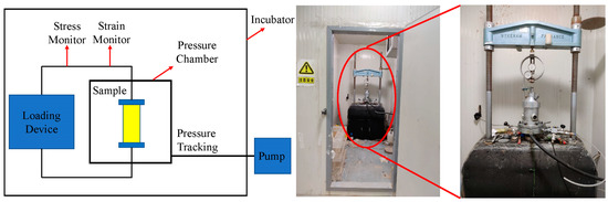 The high-pressure and low-temperature triaxial test system for HBSs of the Institute of Mechanics, Chinese Academy of Sciences, was adopted, as shown in Figure 4 [42]. The sample is placed in the pressure chamber, the confining pressure (σ3) is provided by the pump, the longitudinal load (σ1 − σ3) is provided by the loading device, test data can be recorded by the stress–strain monitor, and the whole system is placed in the incubator, which provides a low temperature. The temperature range of the incubator is −20 °C to 30 °C, which could be set at a constant value during tests (±0.5 °C). The pump can provide a maximum confining pressure of 14 MPa. The sample size has a diameter of a length and the dry bulk density of the sample is .