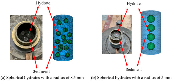 Considering the low permeability of the silty clay samples and the quasi-static loading process, the triaxial unconsolidation undrained (UU) test was conducted by applying an axial compression rate of 0.8 mm/min, and the test was stopped when an engineering strain of 15% was reached. First, the same method was used to obtain the reference mechanical properties of sediment without hydrates. In the tests, spherical hydrates with radii of 8.5 mm and 5 mm were used to explore the influence of nodular hydrate size on the mechanical properties of HBSs, as shown in Figure 5. UU tests were carried out under different confining pressures, from 1 MPa–5 MPa. The volume fraction of hydrate was about 11%, and the same volume was in each sample.