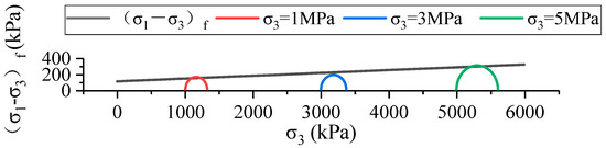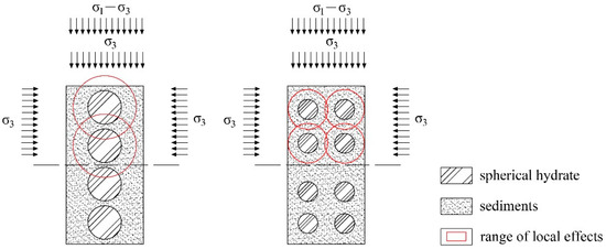 Under the same experimental conditions, the results for the sediment samples containing spherical hydrates () are shown in Figure 9. With the increase in hydrate radius, the mechanical properties of the samples improved, while the curve trends are similar to those of the sediments containing spherical hydrates (). When the confining pressure was greater than 3 MPa, the mechanical properties of the samples in this test also decrease. The reason may be local stress concentrations caused by spherical hydrate occurrence in sediments. According to Saint-Venant’s Principle, the range of local stress concentrations is twice the diameter of spherical hydrates, and they overlap as shown in Figure 10. Under the condition of high confining pressure, the overlapping range of local stress concentrations may lead to the formation of micro-fractures in sediments, resulting in a decrease in the strength of samples.