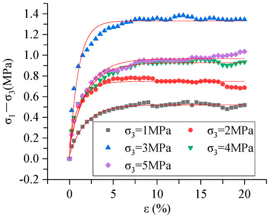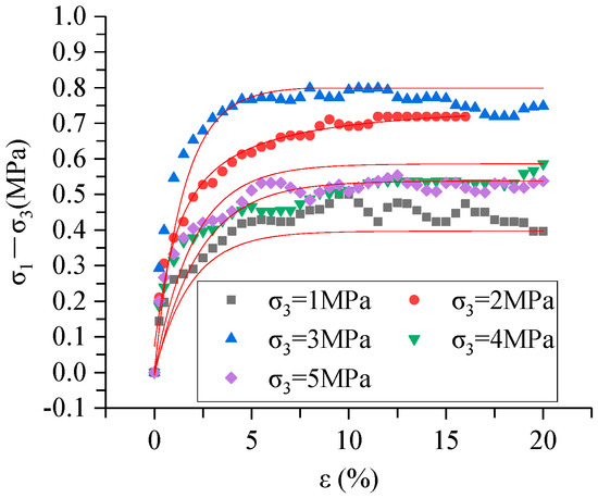 The triaxial test results show that when the confining pressure is less than 3 MPa, the elastic modulus of sediment containing spherical hydrates increases with the increase in confining pressure, but the elastic modulus decreases once the confining pressure is greater than 3 MPa, which may be related to the size effect of internal defects under high confining pressures. The results of different tests with a confining pressure of less than 3 MPa were selected for the fitting of the model parameters. The triaxial test results of sediments without hydrates are shown in Figure 6. The secant modulus was selected to replace the elastic modulus, and the secant modulus of the test samples under various confining pressures is shown in Table 1.