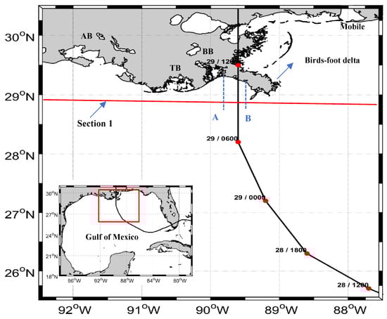 Geographical extents of the Louisiana shelf in the Gulf of Mexico and track of Hurricane Katrina at different dates and times. The horizontal red line and dashed vertical blue lines, respectively, show the location and extent of Section 1 and transect A and B used for representing simulated shelf temperature across the water column, AB: Atchafalaya Bay, TB: Terrebonne Bay, and BB: Barataria Bay.
