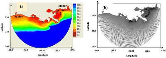The response to Katrina over the Louisiana shelf was simulated using a modeling area with a circular open boundary. The area extends from Mobile, Alabama, to the Sabine Bank, Texas, and comprises the inner Louisiana shelf, its shallow regions, and deep outer-shelf waters (Figure 2a). FVCOM uses a finite volume numerical scheme for solving the governing equations. Hence, an unstructured computational mesh based on triangular elements, which was refined over the shelf, is used (Figure 2b). The mesh and the associated bathymetry were generated in SMS software. The depth data from National Geophysical Data Center (NGDC, https://www.ngdc.noaa.gov, accessed on 1 December 2021) were imported to SMS and were interpolated to the mesh grid points to make the final model bathymetry. Mesh resolution varies from 10 km along the offshore boundary to about 500 m over the inner shelf. In the vertical direction, 25 sigma layers with higher resolutions at the surface and bottom are considered.