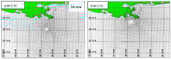 Generated Katrina’s wind field over the Louisiana shelf on 29 August 2005 at 6:00 and 9:00 UTC.