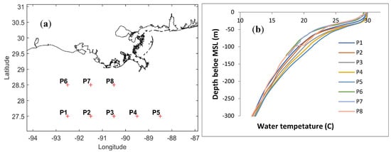 (a) Locations of extracted temperature and salinity profiles from the WOA database over the Louisiana shelf, (b) the corresponding temperature profiles for points P1–P8.