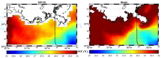 Although the aim of the present study is not to provide a fully realistic hurricane-induced mixing by including all forces, it would be helpful to validate model results with some observations to make sure that the model correctly simulates wind-induced mixing. This can be a reasonable approach since, based on several studies, up to 90% of the mixed-layer heat budget corresponds to the entrainment caused by vertical mixing (in this case by hurricane winds). Water temperature/salinity profiles are controlled by the vertical turbulent mixing, which is resolved using the Mellor–Yamada level 2.5 turbulent closure. Two associated parameters, including the background vertical eddy viscosity () and energy dissipation coefficient (B1), can be used to tune the vertical turbulent flux in the model. The model’s simulated SST and MLD need to be verified, since they will be used for further analysis. Regarding the scarcity of temperature field data, especially temperature vertical profiles during Hurricane Katrina, satellite data of SST can be used for model verification. Satellite sensors, such as MODIS, provide a relatively high spatial resolution (1 km) images of SST with daily time resolution. However, the extensive cloud coverage during Katrina’s impact on the Louisiana shelf contaminated satellite measurements of SST from MODIS and AVHRR, as the measurements are based on infrared and near-infrared wavelength bands. These wavelengths are absorbed by atmospheric water vapor. Since water vapor is transparent to microwave band, SST derived from microwave band can be used for hurricane period. The microwave optimally interpolated (MW-OI) SST is reliable for model evaluation [,]. Data are accessible from the remote sensing systems (www.remss.com, accessed on 28 June 2022). A more recent product combines the measurement by microwave band and the infrared measurement to provide high-resolution (9 km) SST maps for both inner-shelf and outer-shelf regions. SST data from MW-OI are available daily at about 12:00 UTC. It should be noted that the cloudiness itself has an important influence on the origin of tropical storms [,], but in this case, it contaminates the measurement of sea surface temperature through traditional infrared/near-infrared channels.